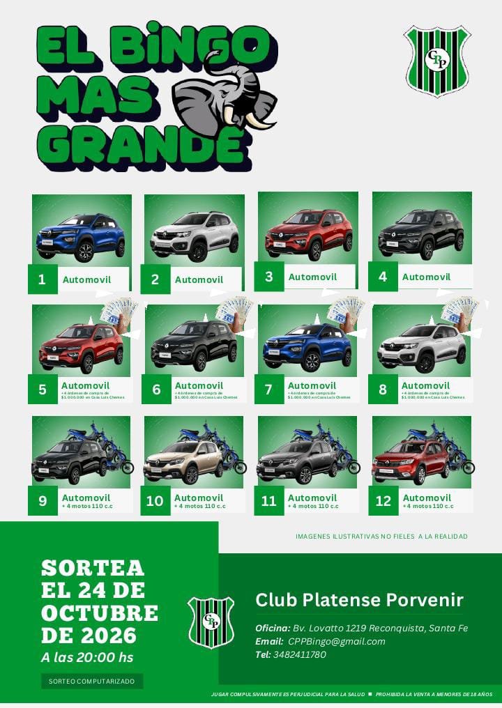 Grandes premios en el Bingo Platense PorvenirVolvió con todo. 12 Autos 0km y Motos te esperan además de los sorteos semanales para ir palpitando la gran fiesta final. Por sólo $ 10.000 por mes (12 cuotas)Pedí info y sumate a esta nueva aventura.Consultar por WhatsApp
