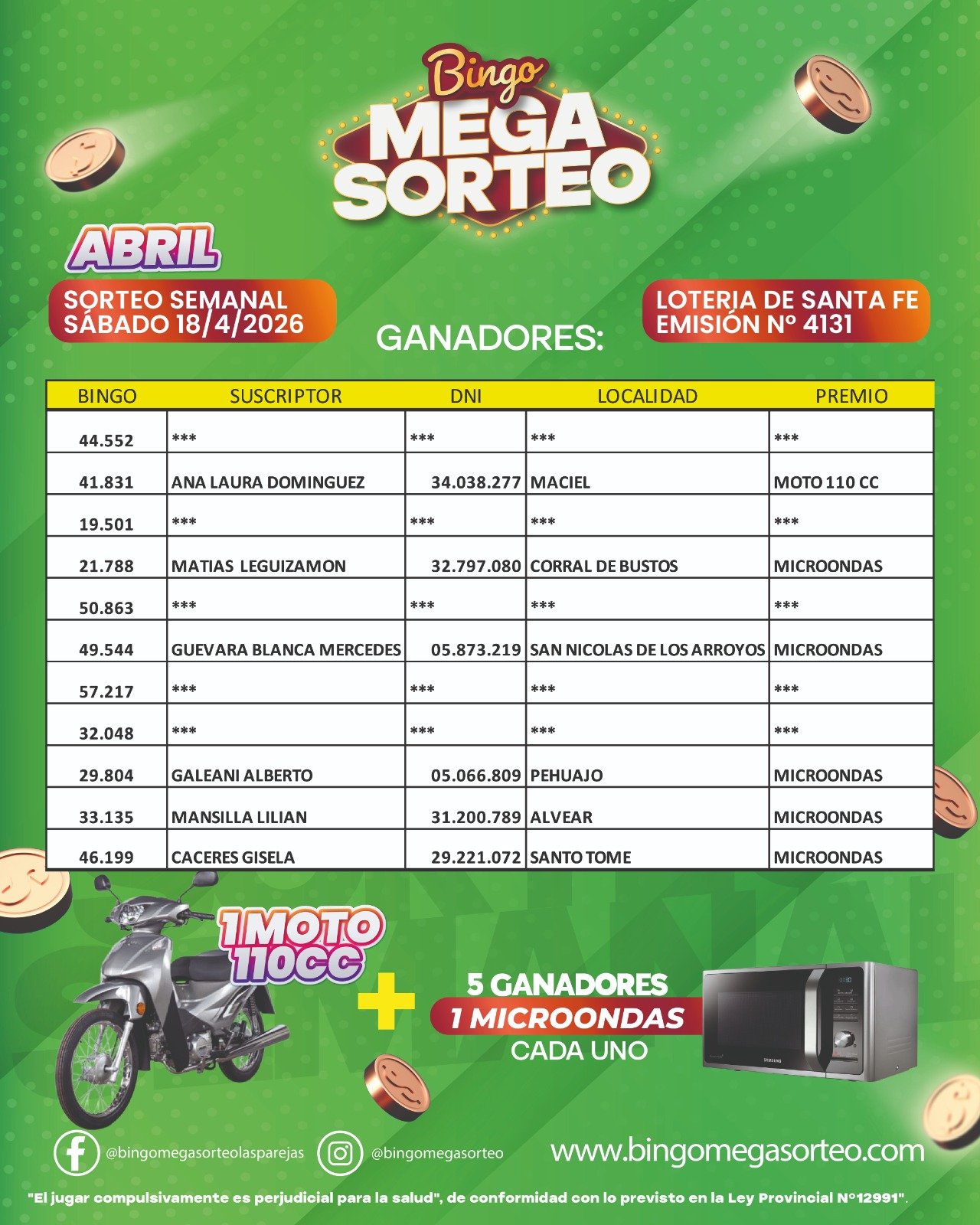 Listado de Ganadores Sorteo Semanal Bingo Mega Sorteo Las Parejas – 18 de Abril 2026