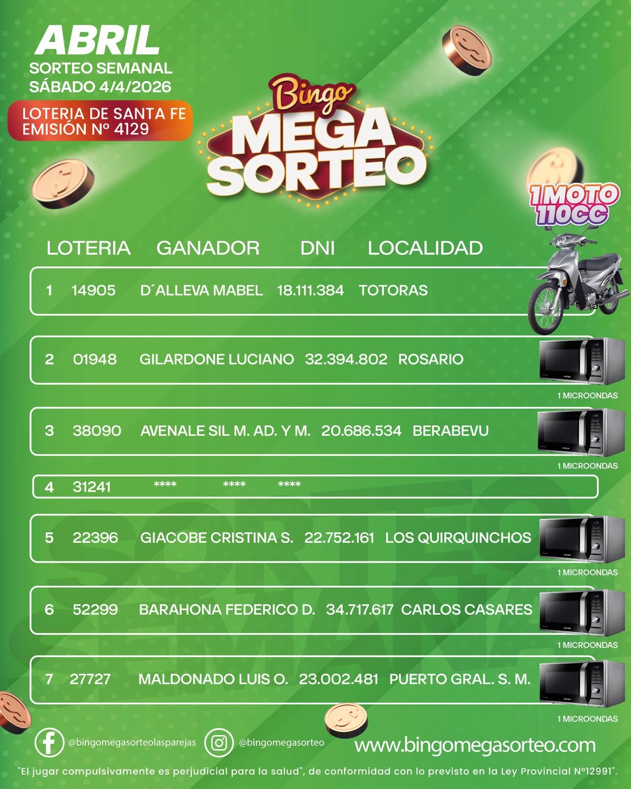 Pedí info completa del Nuevo Bingo Mega Sorteo Las Parejas al 3426114042