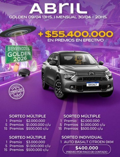 El 30 de Abril. Imperdible. El 1er Auto Citroen Basalt 0 Km. y 55.4 Millones de Pesos en efectivo…